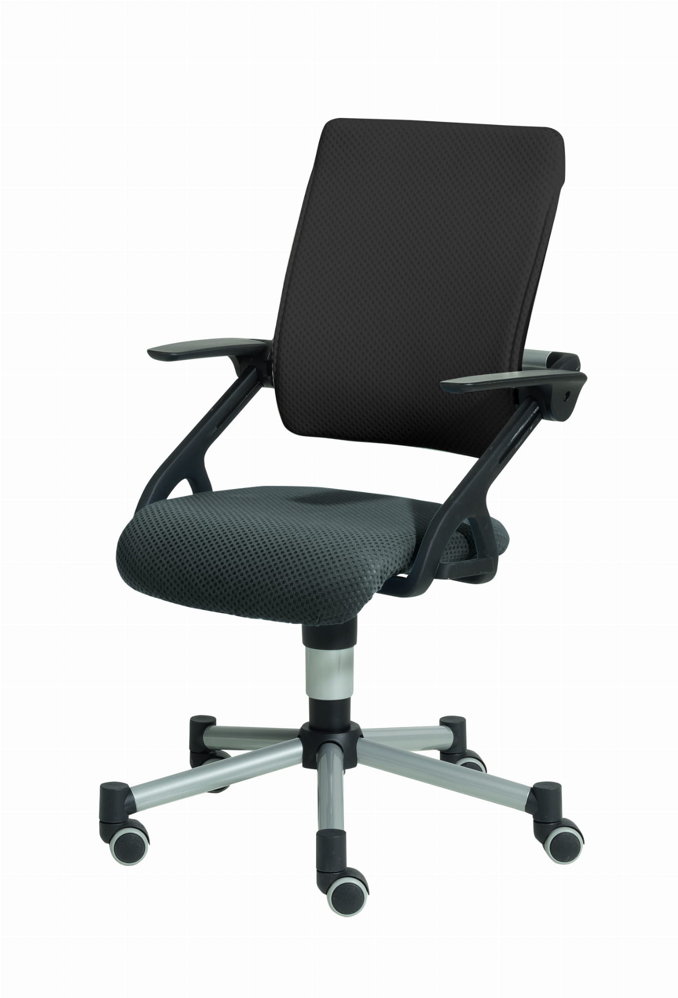 Dwa podnoszone podłokietniki. Płynna regulacja głębokości siedziska i ustawienia oparcia przy pomocy podłokietników.