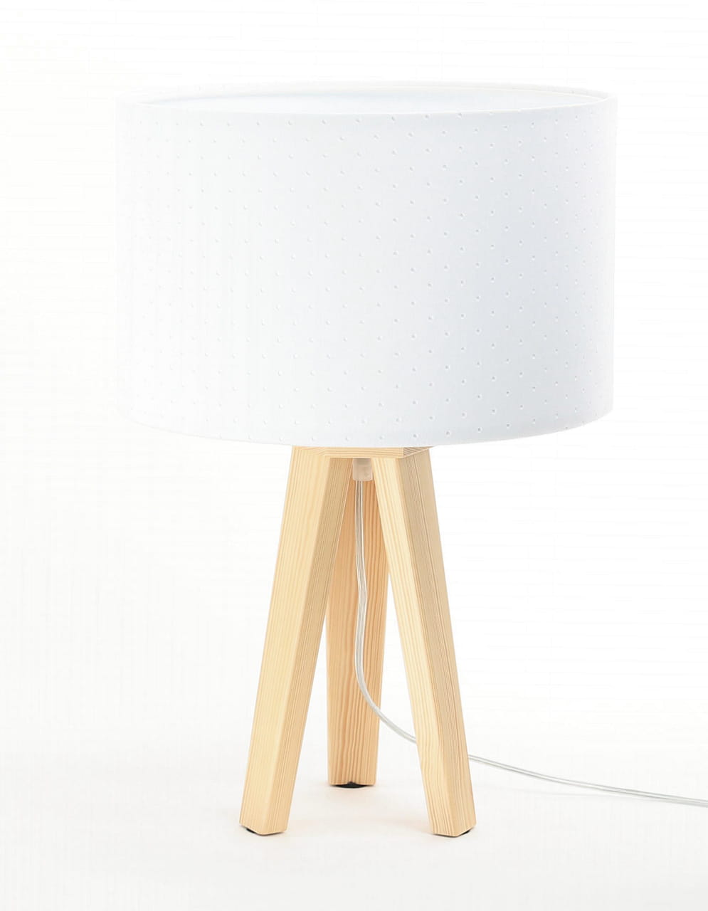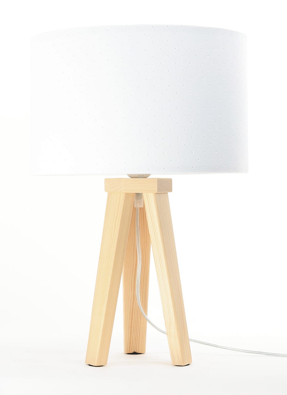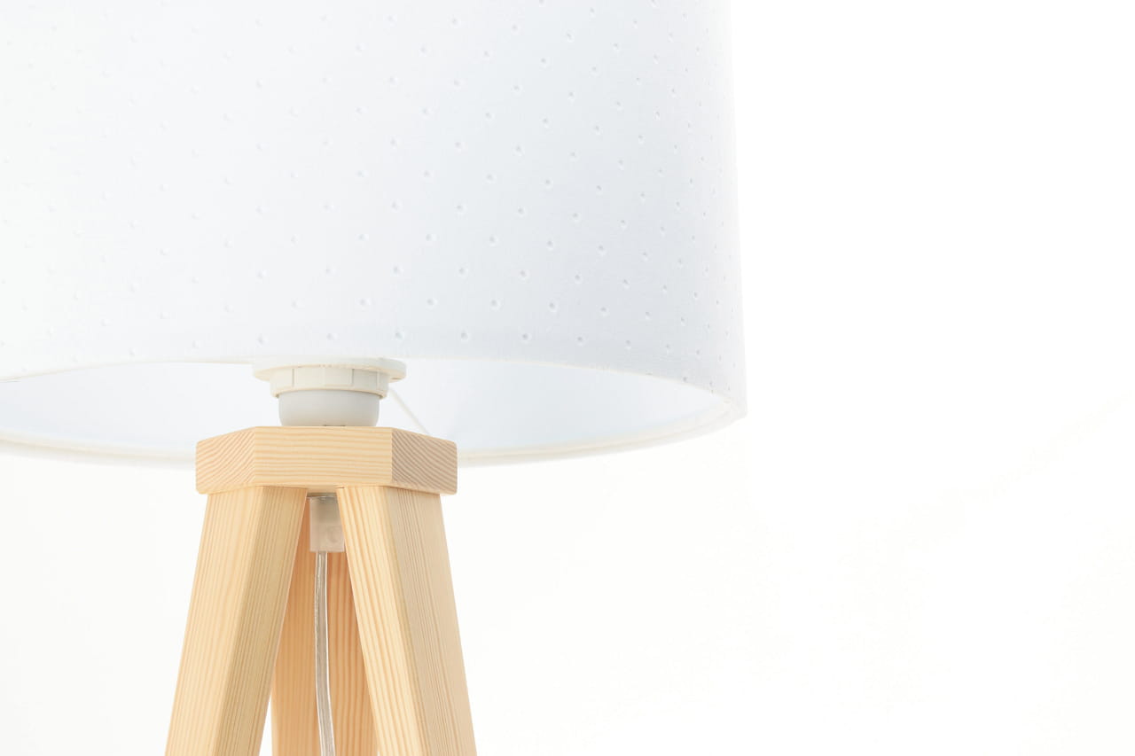 Podstawa lampy - trójnóg w naturalnym kolorze drewna - wykonana jest z drewna sosnowego. Abażur w białym kolorze wykonany jest z pikowanej tkaniny jaśminowej rozpiętej na białym tworzywie PCW. Lampa wyposażona jest w jedno źródło światła, pod żarówki o gwincie E27 i maksymalnie dopuszczalnej mocy 60W. Do oprawki można stosować żarówki klasyczne, energooszczędne lub LEDowe. Wyposażona jest w bezbarwny przewód z włącznikiem przesuwnym o długości 250 cm.