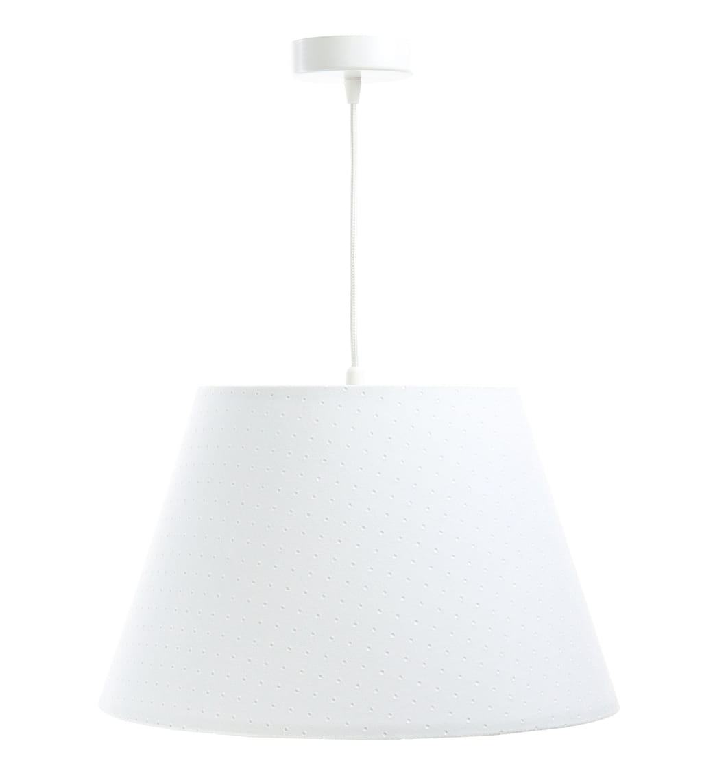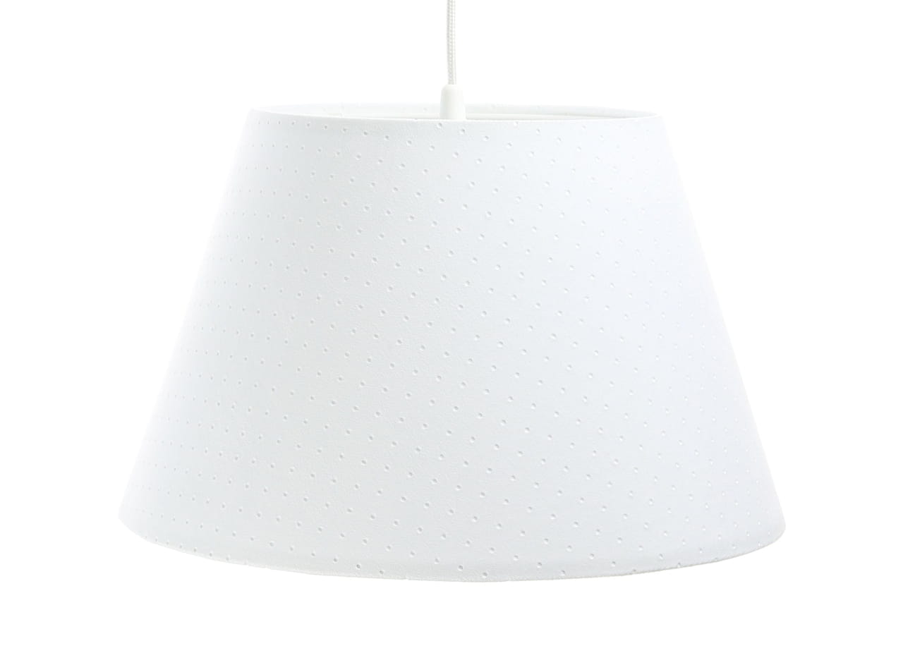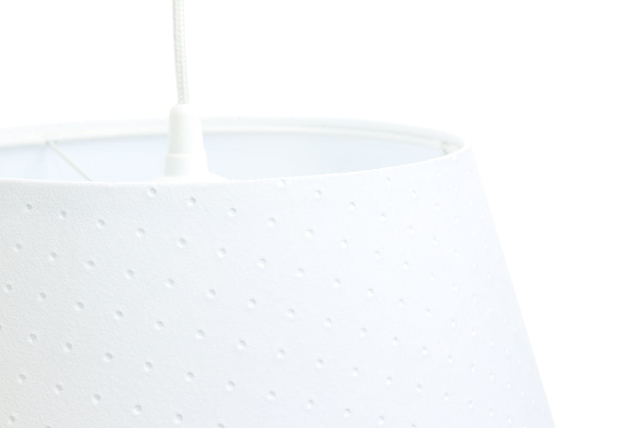 Abażur w białym kolorze wykonany jest z oryginalnej w wyglądzie, pikowanej tkaniny jaśminowej, rozpiętej na białym tworzywie PCW. Ma klasyczny kształt stożka. Lampa wyposażona jest w jedno źródło światła, pod żarówki o gwincie E27 i maksymalnie dopuszczalnej mocy 60W. Do oprawki można stosować żarówki klasyczne, energooszczędne lub LEDowe. Podsufitówka jest metalowa, malowana na biało, a dołączony przewód jest w białym oplocie, zatem wszystkie elementy są kolorystycznie spójne i razem tworzą przemyślaną całość.