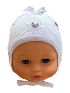 Przejściowa czapeczka, wiązana pod szyją, dla małej królewny, polskiej firmy Barbaras. Czapeczka jest podwójna, wierzchnia warstwa z bawełnianej dzianiny, spód z cienkiej bawełny. Czapka jest biała, na górze ma delikatną, sznurkową kokardkę, a na czapeczce przyszyte są małe srebrne motylki z tiulowymi skrzydełkami.