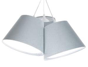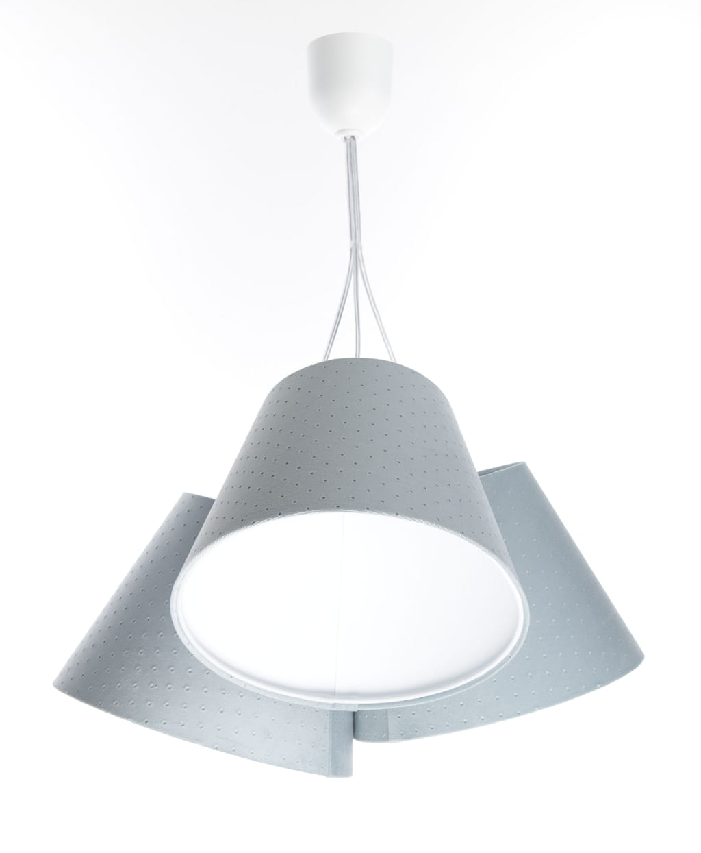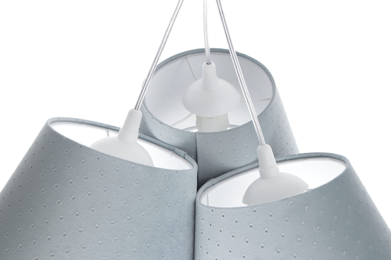 Abażur w jasnym, niebieskim kolorze wykonany jest z oryginalnej w wyglądzie, pikowanej tkaniny jaśminowej, rozpiętej na białym tworzywie PCW. Ma klasyczny kształt stożka. Lampa wyposażona jest w trzy źródła światła, pod żarówki o gwincie E27 i maksymalnie dopuszczalnej mocy 60W. Do oprawki można stosować żarówki klasyczne, energooszczędne lub LEDowe. Podsufitówka jest biała, wykonana z tworzywa sztucznego, a przewód jest transparentny, zatem wszystkie elementy są tworzą harmonijną całość.
