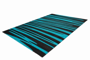 Nowoczesny wygląd dywanu w nieregularne pasu w świetnych kolorach czarno turkusowych sprawiają, że dywan świetnie się prezentuje w większości pomieszczeń.