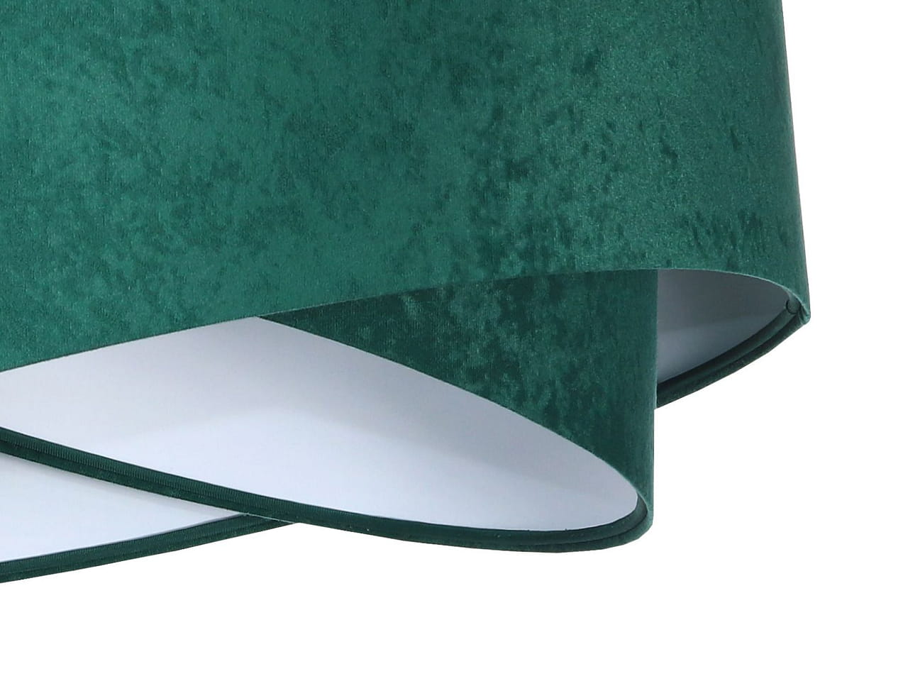 Każdy żyrandol jest unikatowy, robiony ręcznie pod zamówienie z wysokiej jakości materiałów. Klosz wykonany jest z białego tworzywa PWC, z zewnątrz powleczony jest welurową tkaniną w butelkowym, zielonym kolorze. Lampa wyposażona jest w jedno źródło światła, pod żarówki o gwincie E27 i maksymalnie dopuszczalnej mocy 60W. Do oprawki można stosować żarówki klasyczne, energooszczędne lub LEDowe. Podsufitówka jest metalowa, malowana na biało, a dołączony przewód jest transparentny. Wszystkie elementy są harmonijnie dobrane i razem tworzą przemyślaną całość.