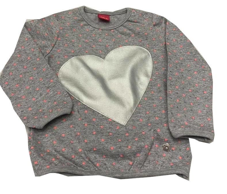 Szara bluza, sweterek niemowlęcy przez głowę, polskiej firmy Atut. Bluza zapinana na jednym ramieniu na dwie napki. Na szarym tle są małe różowe groszki i jeszcze mniejsze srebrne kropeczki. Na przodzie jest naszyte duże, srebrne serce. Bluza jest wykończona cienkimi, lekko ściągającymi, szarymi lamówkami.