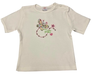 Bawełniana bluzeczka z krótkim rękawkiem polskiej firmy Makoma. Bluzeczka jest w jasnym kolorze ecru, a na przodzie ma wyhaftowanego pięknego, kolorowego motylka.