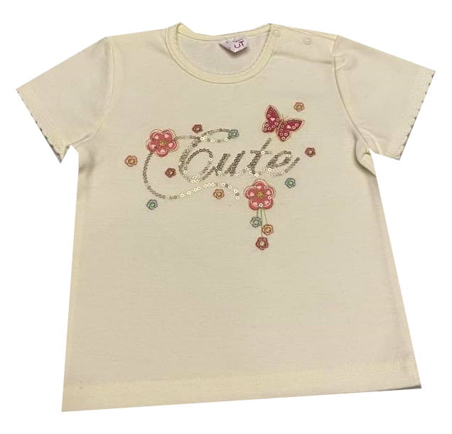 Letnia bluzeczka z krótkim rękawkiem dla małej dziewczynki polskiej firmy Atut. Bluzeczka jest kremowa, przy szyi i na zakończeniu rękawków zakończona ozdobną kroszetką. Na przodzie bluzeczki jest śliczna, haftowana, kolorowa aplikacja przedstawiająca motylka i kwiatki, ozdobiona błyszczącymi cekinkami.