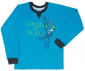 Bawełniana bluzka chłopięca z długim rękawem, polskiego producenta AJS. Bluzeczka dla małego zdobywcy Galaktyki. Jest w kolorze niebieskim. Pod szyją ma granatową lamówkę. Bluzka jest na dole prosta, a rękawy zakończone są granatowymi ściągaczem. Na przodzie jest duża aplikacja z rysunkami startujących rakiet i zielony napis.