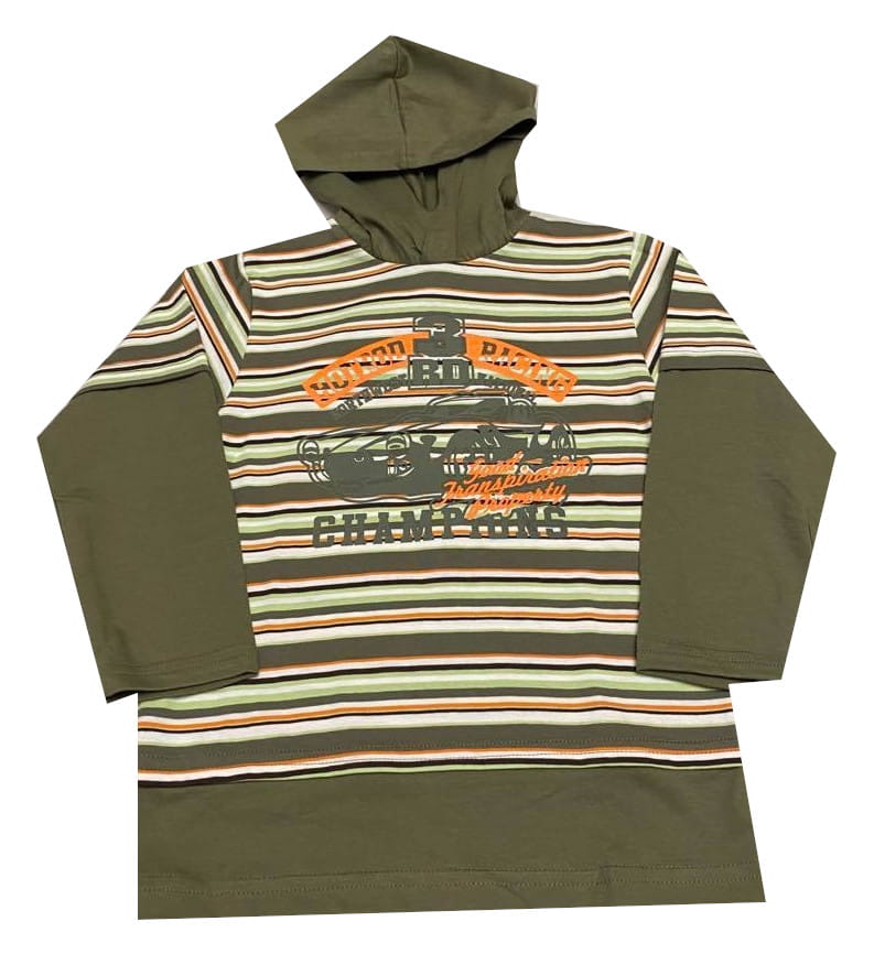 Chłopięca bluzka z długim rękawem i kapturkiem polskiej firmy Anna. Bluzka jest w jasnym kolorze khaki i wygląda jakby na wierzchu miała kolorową podkoszulkę z krótkim rękawem, całą w biało-pomarańczowo-zielone paseczki. Na przodzie bluzki jest pomarańczowo-zielona, duża aplikacja. Bluzka ma cienki, zielony kaptur.