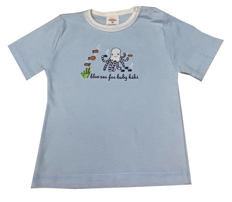 Bawełniana bluzeczka z krótkim rękawkiem polskiej firmy Makoma. Bluzeczka jest jasno niebieska, wykończona pod szyją białą lamówką, a na przodzie ma wyhaftowaną uśmiechniętą ośmiornicę wśród rybek.