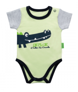 Body niemowlęce z kolekcji Crocodile Style polskiej firmy Barbaras. Body z krótkim rękawem, w kolorze blado seledynowym, z szarymi rękawkami i granatową lamówką przy szyi i w kroku. Na przodzie aplikacja ze śmiesznym krokodylem. Body zapinane jest na ramieniu i w kroku na bezniklowe napki.