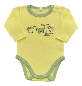 Body niemowlęce z kolekcji Dinozaury polskiej firmy Barbaras. Body z długim rękawem, w kolorze żółtym. Na przodzie trzy, śmieszne dinozaury.