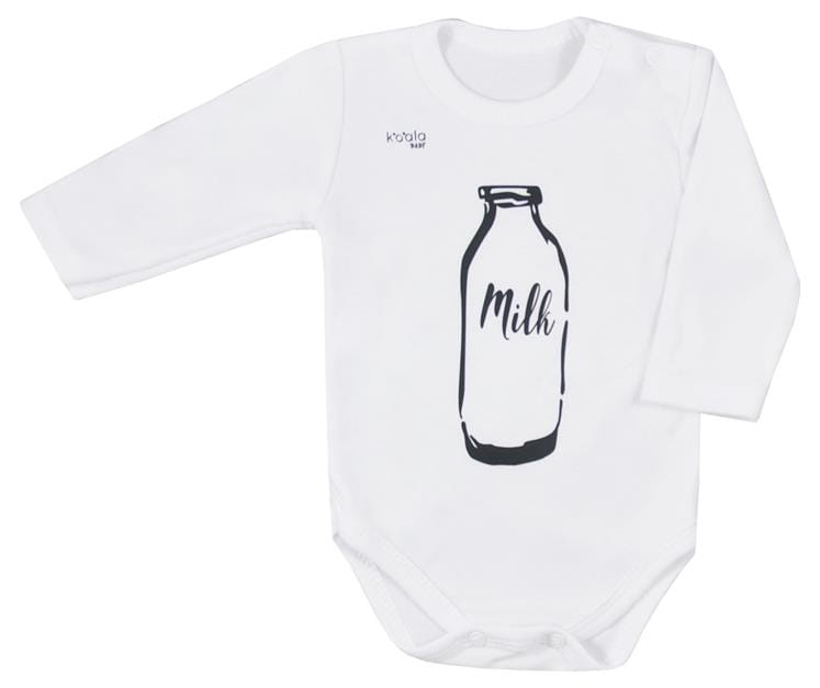 Designerskie body niemowlęce w kolorze białym, z czarnym rysunkiem butelki mleka, które jak wiadomo dla niemowlaka jest rzeczą najważniejszą na świecie. Body dla starszych niemowlaków, zapinane jest na ramieniu i w kroku na napki.