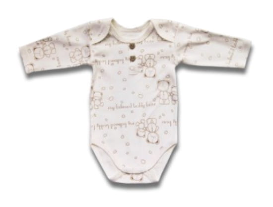Body niemowlęce w kolorze ecru, drukowane w beżowe misie. Z przodu, pod szyją, imitacja zapięcia z dwoma guziczkami. Wyjątkowo miękka i delikatna bawełna.