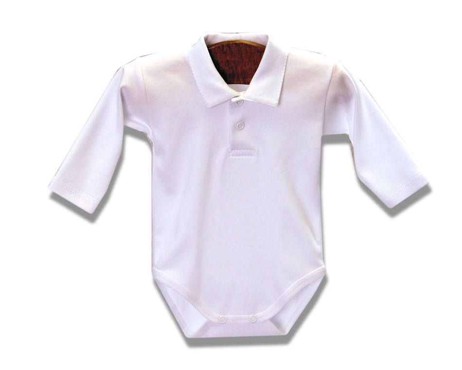 Klasyczne białe body polo dla małego chłopca, zapinane na dwie napki pod szyją i w kroku. Wykonane z wysokiej jakości, miękkiej bawełny, z długim rękawkiem. Proste i eleganckie. Bardzo wygodne, idealne na chrzciny i do innych, wyjściowych kompozycji.