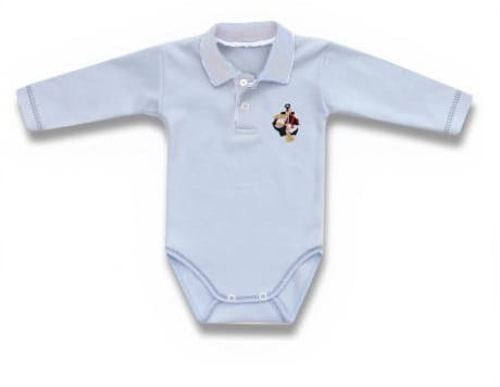 Jasnoniebieskie body z długim rękawem, w stylu marynarskim, z kołnierzykiem i elegancką, delikatnie przyozdobioną złotem, aplikacją kotwicy na piersi. Body zapinane jest na dwie napki, pod szyją i w kroku. Wykonane jest z wysokiej jakości, miękkiej bawełny. Proste i eleganckie. Bardzo wygodne, idealne na różne okazje.