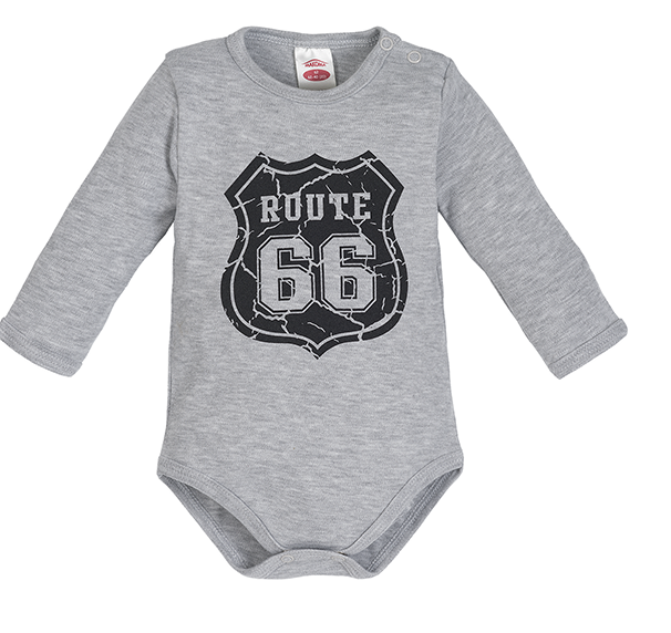 Body w szarym kolorze, z kolekcji Route, polskiej firmy Makoma. Stonowane, fajne body dla chłopca. Body jest zapinane na ramieniu i w kroku na napki. Na przodzie ma jednokolorową aplikację z numerem. Wykonane z miękkiej i wysokogatunkowej bawełny.
