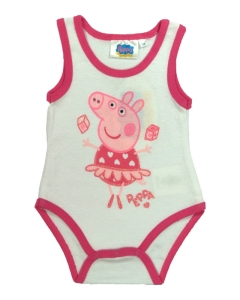 Body niemowlęce z kultową Świnką Peppa. Body bez rękawów w kolorze białym, z ciemno różowymi lamówkami i dużym wizerunkiem tańczącej Peppy na przodzie. Body na ramiączka, zapinane w kroku na napki.