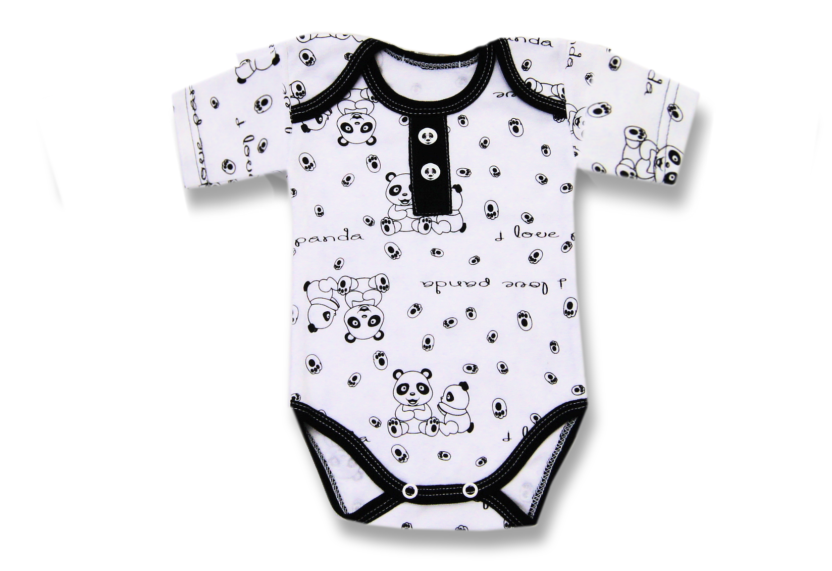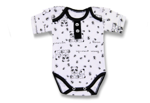 Białe body niemowlęce, z krótkim rękawem z czarno-białej kolekcji Panda polskiego producenta ubranek dziecięcych Lafel. Body jest białe i ma nadrukowane, czarne wzory przedstawiające pandy, spody łapek i napis I love panda. Dekolt wykończony jest kontrastową, czarną lamówką, którą jest również obszyty dół body. Pod szyjką, na czarnej lamówce są dwa, dekoracyjne guziczki w kształcie głowy pandy. Bodziak zapinany jest w kroku na bezniklowe napki.