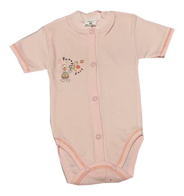Body niemowlęce z krótkim rękawem polskiej firmy Koala. Body jest całe rozpinane po środku i w kroku. Body w kolorze jasno różowym, z jednej strony po boku jest aplikacja ze śmiesznym kurczaczkiem. Body uszyte jest z miękkiej bawełny, wykończone różową lamówką. Zarówno po środku, jak i w kroku zapinane jest na napki.