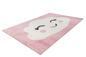 Przeuroczy, mięciutki i wytrzymały, syntetyczny dywan o średniej długości włosiu w rozmiarze 80 x 150 cm przeznaczony do dziecięcego pokoju. Dywan ozdobiony jest zabawnym, przyjaznym dla dziecka wzorem w uśmiechniętą chmurkę w subtelnej różowo-szarej kolorystyce.