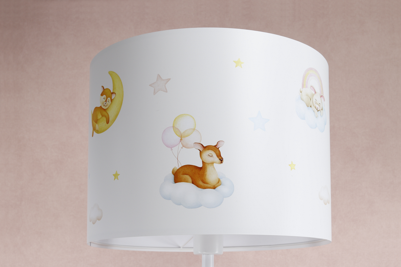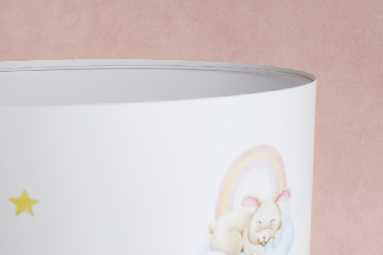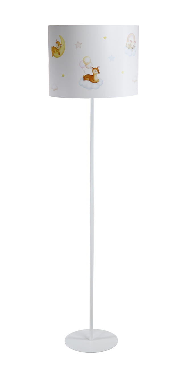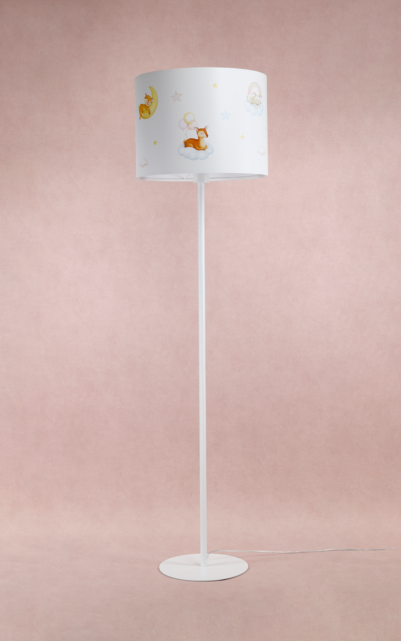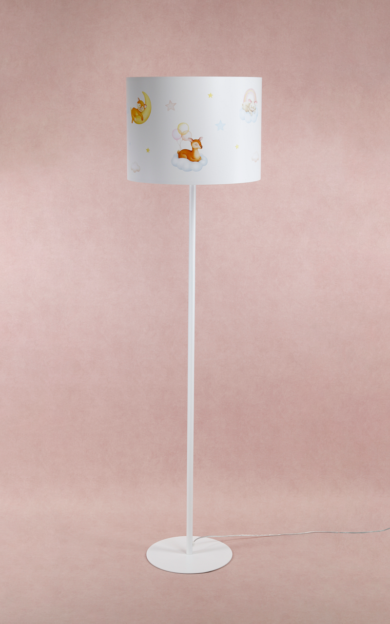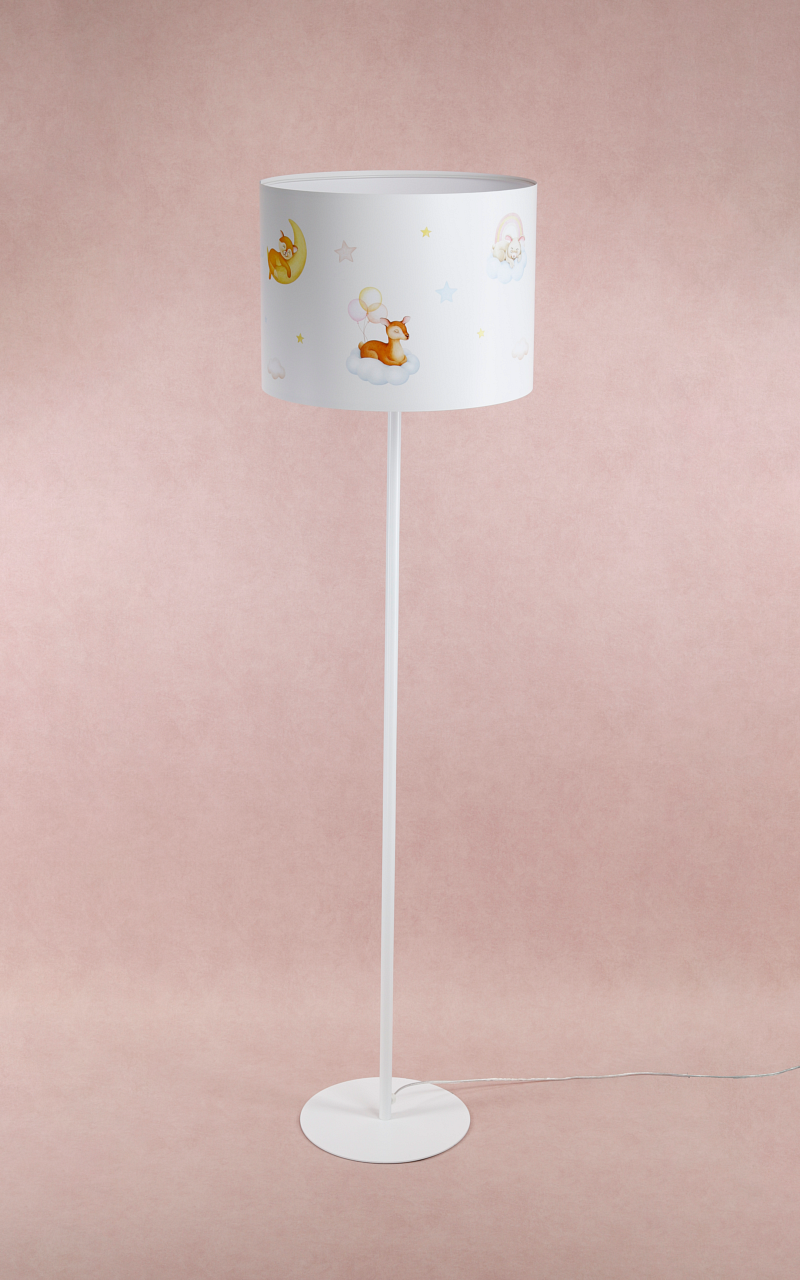 Podłogowa lampa stojąca do pokoju dziecięcego w białym kolorze. Lampa z nadrukowana grafiką przedstawiającą urocze zwierzątka latające na chmurkach po niebie. Wnętrze abażuru w białym kolorze. Lampa świetnie prezentuję się przy włączonym oświetleniu, grafika abażuru w połączeniu z delikatnym światłem prezentuję się zachwycająco.