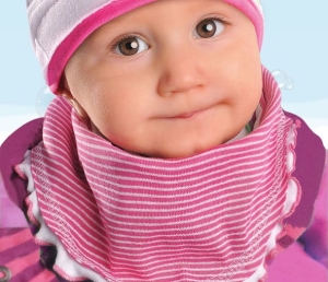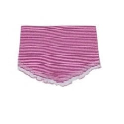 Chustka trójkątna pod szyję, apaszka dziecięca dla małej dziewczynki polskiej firmy AJS. Chustka jest z podwójnej bawełny, na zewnątrz różowa w białe, wąskie paseczki, od wewnątrz gładka, biała. Dookoła wykończona jest wąską, białą falbanką. Chustka zapinana jest z tyłu na metalową napkę. Niewielki dodatek elastanu sprawia, że chustka jest wygodna i dopasowuje się do dziecięcej szyi.