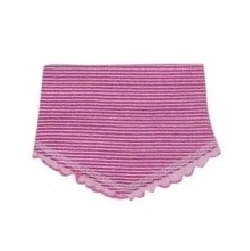 Chustka trójkątna pod szyję, apaszka dziecięca dla małej dziewczynki polskiej firmy AJS. Chustka jest z podwójnej bawełny, na zewnątrz różowa w białe, wąskie paseczki, od wewnątrz gładka, jasno różowa. Dookoła wykończona jest wąską, jasno różową falbanką. Chustka zapinana jest z tyłu na metalową napkę. Niewielki dodatek elastanu sprawia, że chustka jest wygodna i dopasowuje się do dziecięcej szyi.