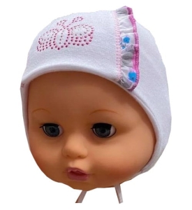 Bawełniana, wiązana czapeczka dla niemowlaka polskiej firmy Magrof. Czapeczka jest biała, ma kolorową, pionową falbankę i różowego, błyszczącego motylka na przodzie. Na dole, z tyłu i na przedłużonych bokach czapeczka jest podwójna, dzięki czemu dobrze kryje uszy dziecka.