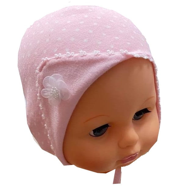 Bawełniana czapeczka dla maluszka produkcji polskiej. Czapeczka jest różowa w białe kropeczki. Uszyta jest z dwóch warstw tkaniny bawełnianej, wewnętrzna warstwa jest gładka różowa. Czapka ma wygodny kształt, a na przodzie z jednej strony ma trójkątne wywinięcie, z ozdobnym, tiulowym kwiatuszkiem.