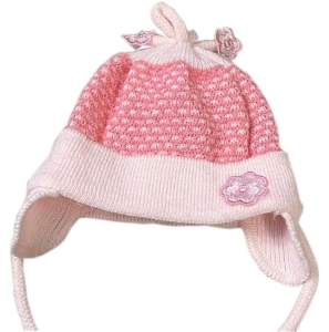 Przejściowa, wiązana czapeczka dla noworodka, wcześniaka polskiej firmy Artex. Czapeczka jest różowa, przybrana kwiatuszkami i jest zawiązywana pod brodą.