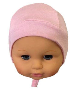 Bawełniana, wiązana czapeczka dla niemowlaka produkcji polskiej. Czapeczka jest w kolorze różowym. Uszyta jest z delikatnej bawełny, dobrze się układa i dobrze kryje uszka dziecka.