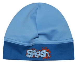 Bawełniana czapka dla małego chłopca, polskiej firmy MK Golińscy. Czapka jest jasno niebieska, z przodu przy buzi ciemno niebieska, z kolorowym haftem.