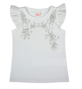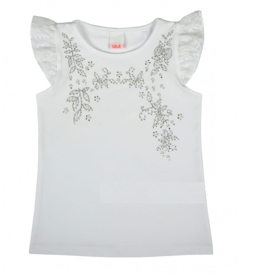 Elegancka, biała bluzeczka dziewczęca polskiej firmy Atut. Bluzeczka ma małe, motylkowe, koronkowe rękawki, a na przodzie subtelny, kwiatowy motyw, ślicznie ozdobiony małymi, srebrnymi jettami.