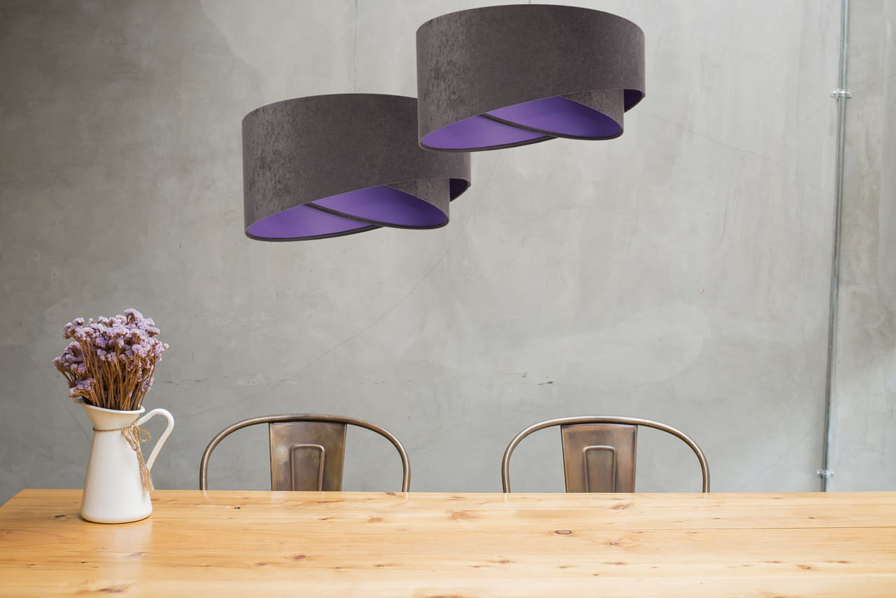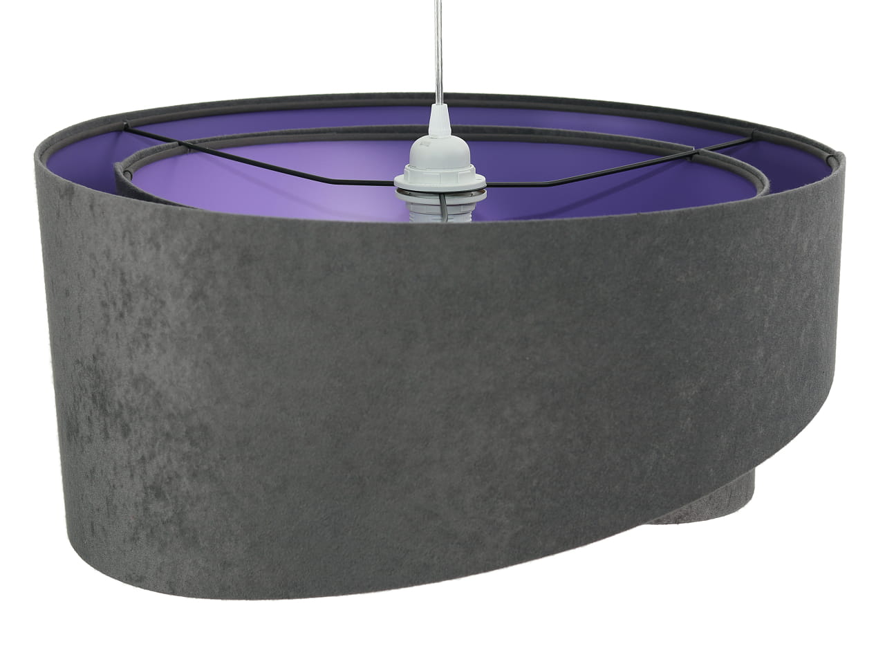 Każdy żyrandol jest unikatowy, robiony ręcznie pod zamówienie z wysokiej jakości materiałów. Klosz wykonany jest z fioletowego tworzywa PWC, z zewnątrz powleczony jest welurową tkaniną w ciemnym, szarym kolorze. Lampa wyposażona jest w jedno źródło światła, pod żarówki o gwincie E27 i maksymalnie dopuszczalnej mocy 60W. Do oprawki można stosować żarówki klasyczne, energooszczędne lub LEDowe. Podsufitówka jest metalowa, malowana na biało, a dołączony przewód jest transparentny. Wszystkie elementy są harmonijnie dobrane i razem tworzą przemyślaną całość.