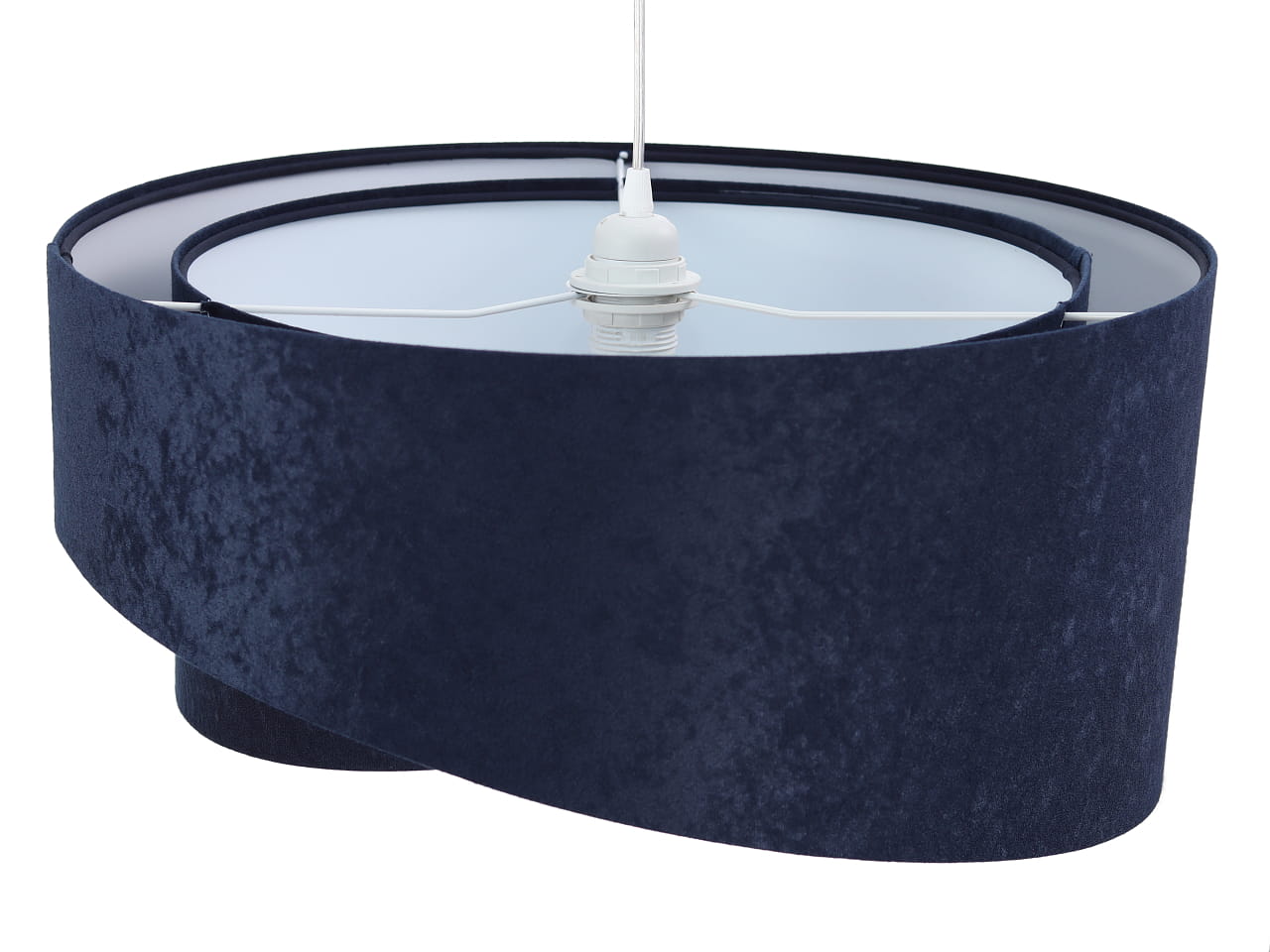 Każdy żyrandol jest unikatowy, robiony ręcznie pod zamówienie z wysokiej jakości materiałów. Klosz wykonany jest z białego tworzywa PWC, z zewnątrz powleczony jest welurową tkaniną w głębokim, granatowym kolorze. Lampa wyposażona jest w jedno źródło światła, pod żarówki o gwincie E27 i maksymalnie dopuszczalnej mocy 60W. Do oprawki można stosować żarówki klasyczne, energooszczędne lub LEDowe. Podsufitówka jest metalowa, malowana na biało, a dołączony przewód jest transparentny. Wszystkie elementy są harmonijnie dobrane i razem tworzą przemyślaną całość.