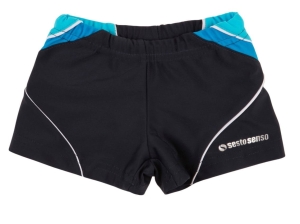 Kąpielówki chłopięce w prawdziwie męskich kolorach. Kąpielówki są czarne, łączone ze wstawkami w kolorze niebieskim i błękitnym, mają też małe, białe wstawki i napis. Wewnątrz, na przodzie, dodatkowa, biała warstwa. W pasie jest gumka i sznureczek.