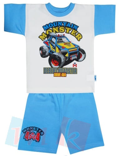 Letni komplet dla chłopca, w kolorze biało-błękitnym polskiej firmy MK Golińscy. Komplet składa się z koszulki z krótkim rękawkiem i krótkich spodenek .Na koszulce jest duży, samochód terenowy - monster. Spodenki mają w pasie gumkę, a na dole jednej nogawki mały napis.