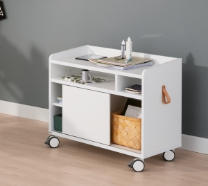 Kontenerek do kółkach na szycie posiada uchwyt do wygodniejszego przemieszczania. Posiada 3 rządy półek oraz przesuwne drzwi, które zakrywają połowę półek.