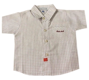 Bawełniana koszula niemowlęca dla małego eleganta, biała w drobną, niebieską i czerwoną kratkę.