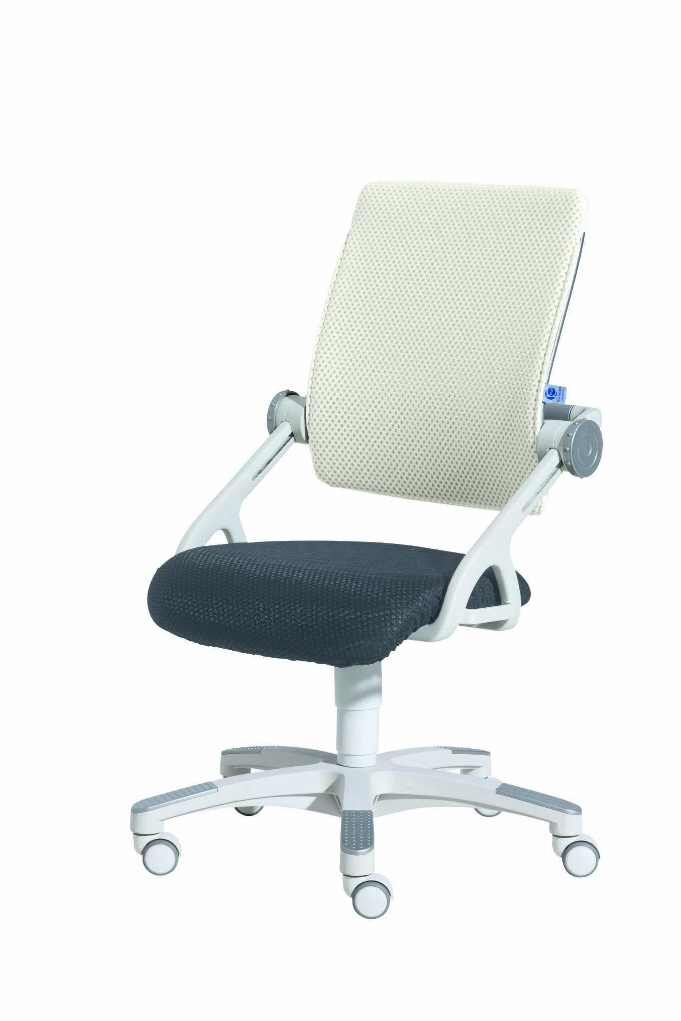 Krzesełko bez podłokietników posiada regulowaną wysokość oparcia oraz głębokość siedzenia.