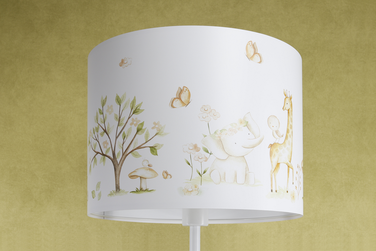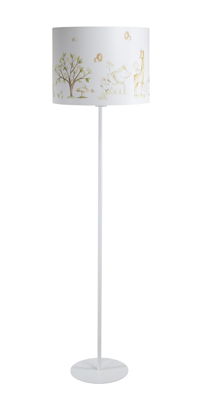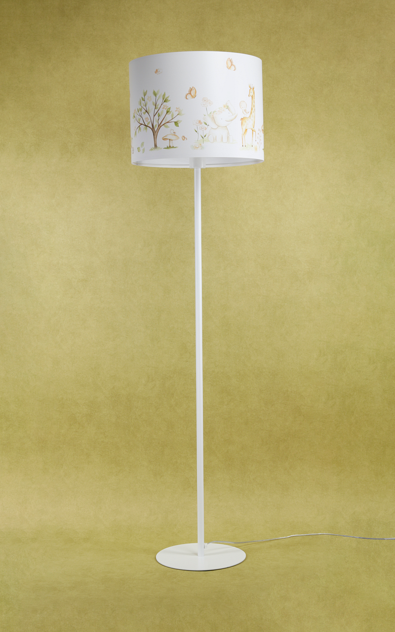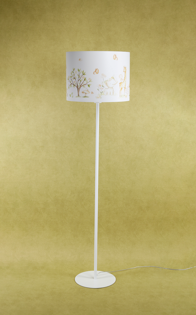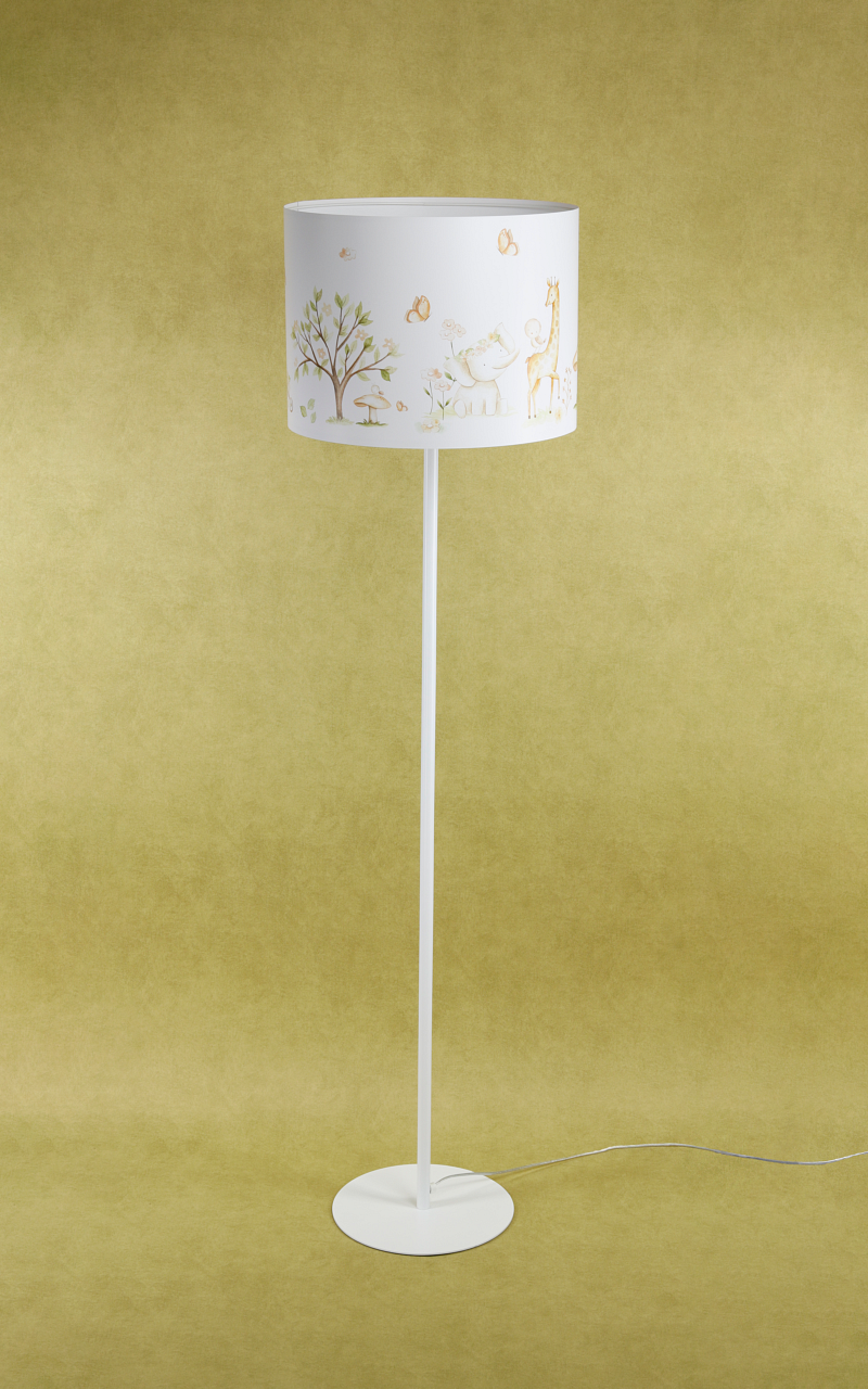 Podłogowa lampa stojąca do pokoju dziecięcego w białym kolorze. Lampa z nadrukowana grafiką przedstawiającą urocze zwierzątka w magicznym lesie. Wnętrze abażuru w białym kolorze. Lampa świetnie prezentuję się przy włączonym oświetleniu, grafika abażuru w połączeniu z delikatnym światłem prezentuję się zachwycająco.