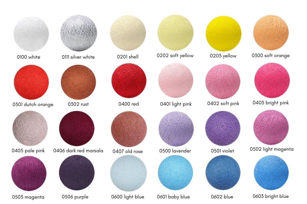 Wspaniale wyglądający i świetnie wykonany zestaw ręcznie robionych bawełnianych lampek Cotton Balls. Zestaw zawiera przewód z 20 żarówkami LED podłączany wyczką do gniazdka. Przewód posiada dodatkowo ręczny włącznik lampek. 10 bawełnianych ręcznie plecionych Cotton Balls w dowolnej kolorystyce.