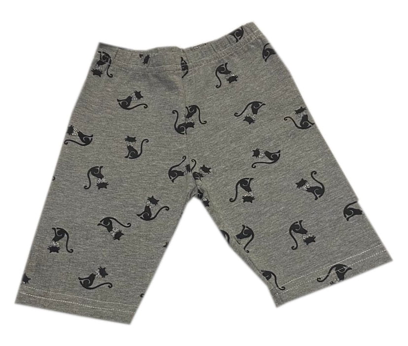 Krótkie legginsy dziewczęce produkcji polskiej firmy MK Golińscy. Legginsy w kolorze szarym, z nadrukiem wytwornych, czarnych kotów ze srebrną, brokatową kokardą.