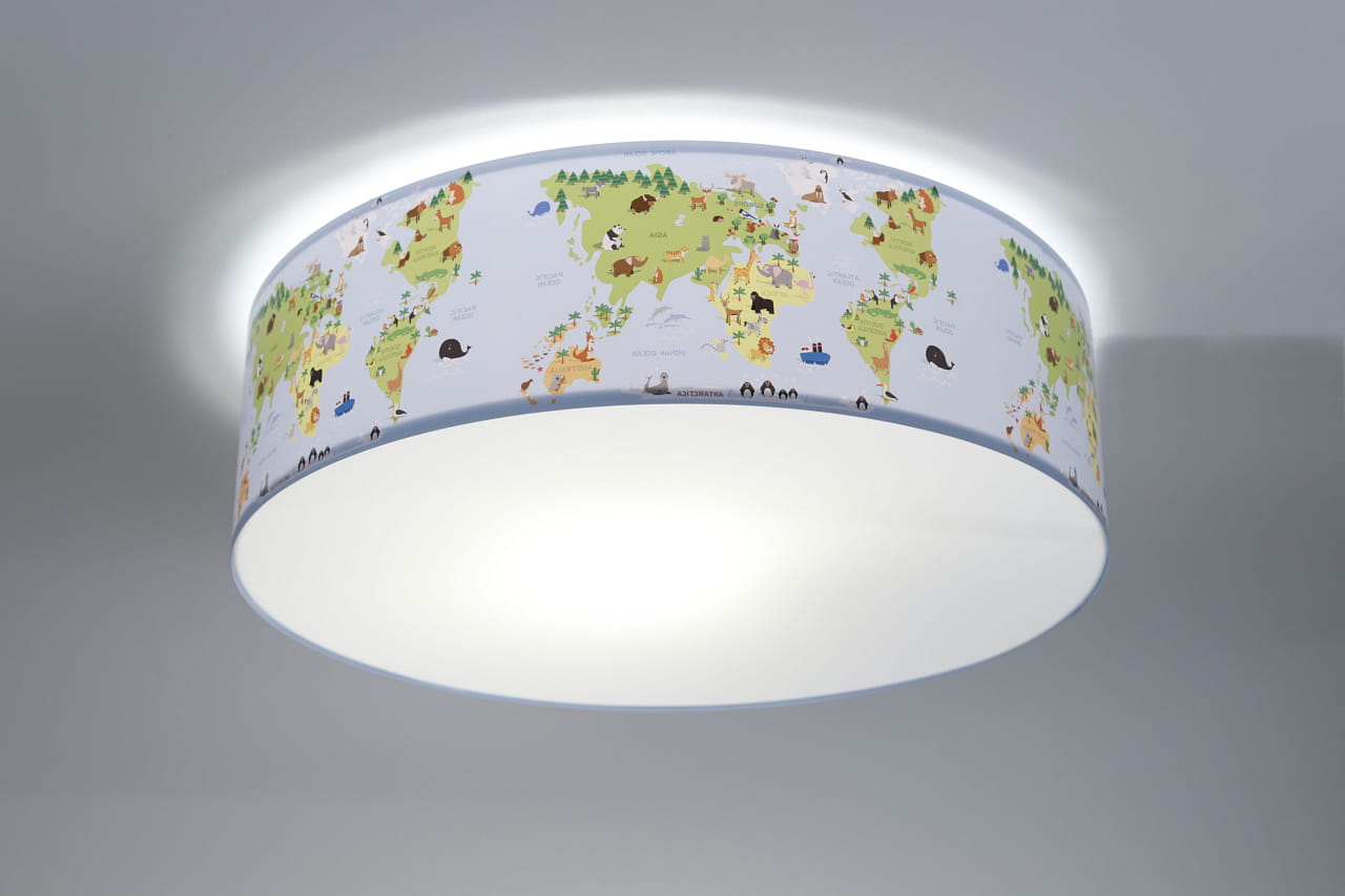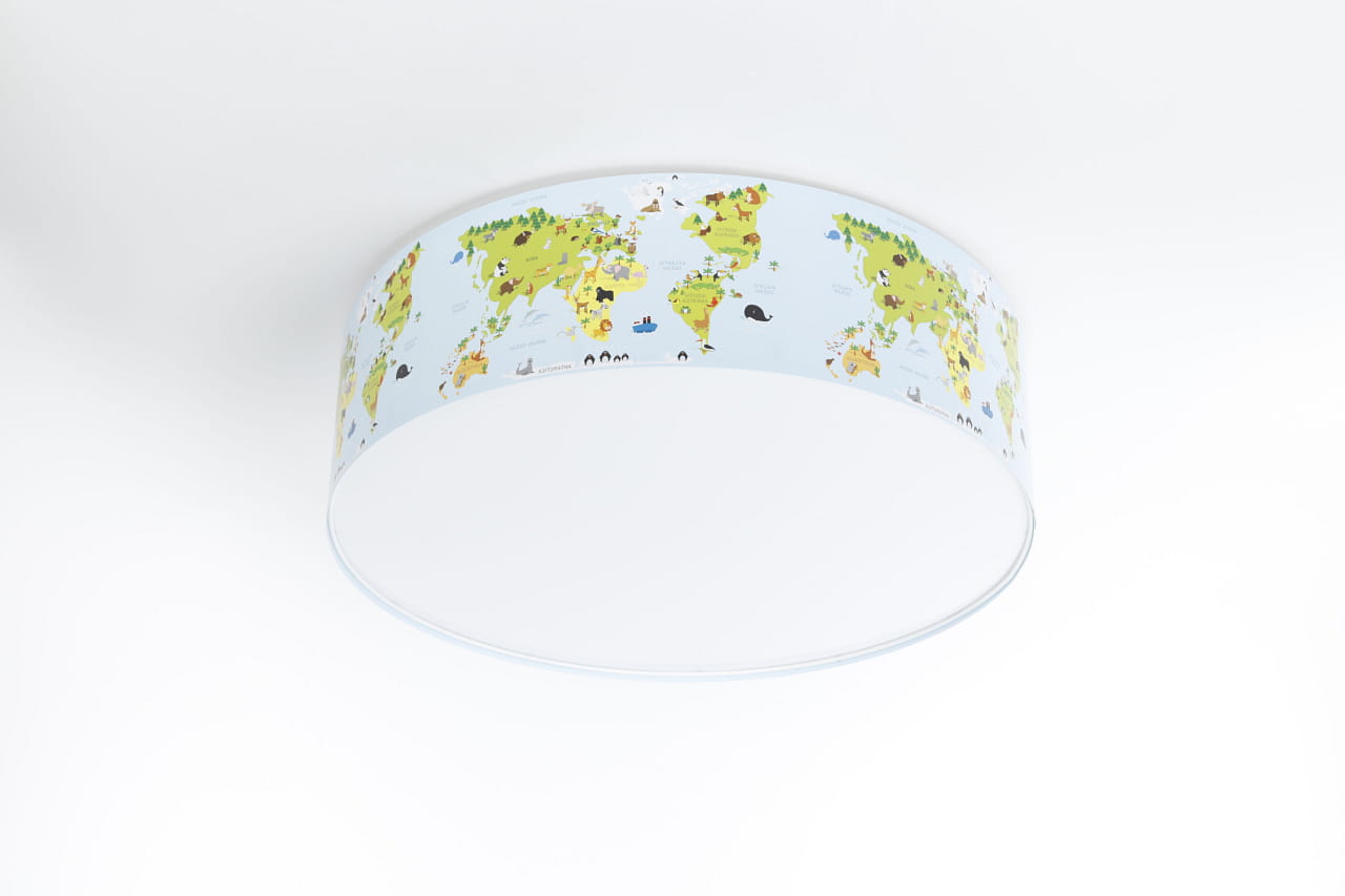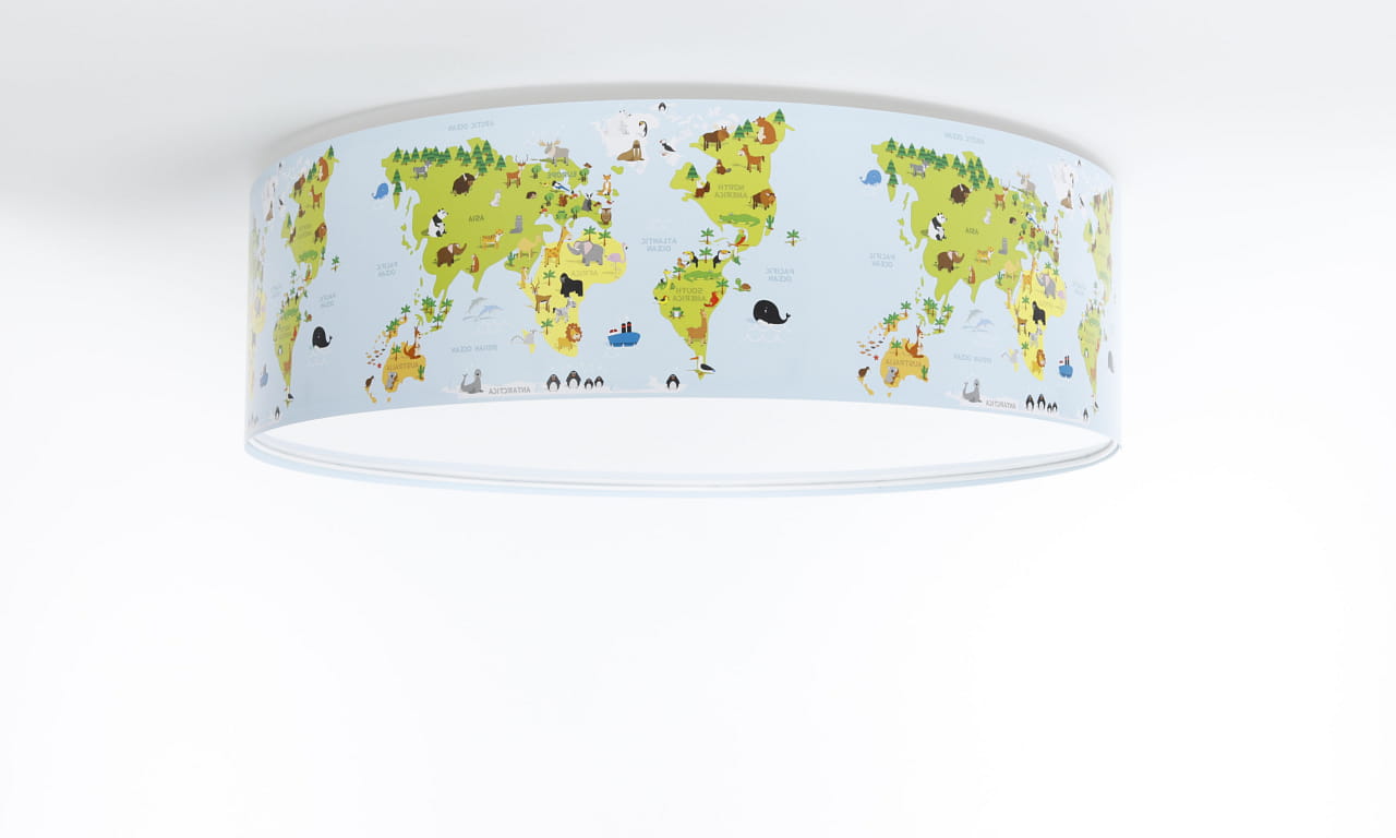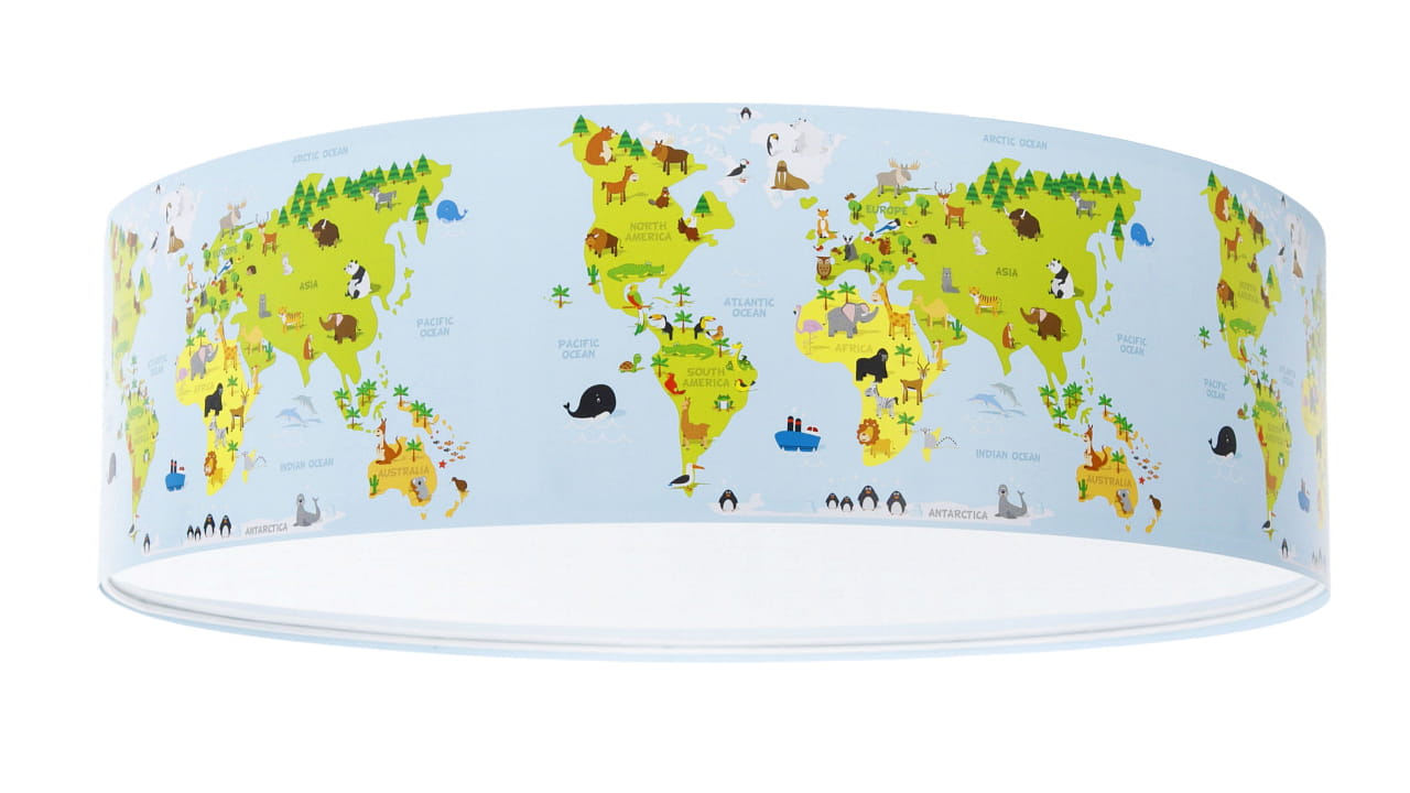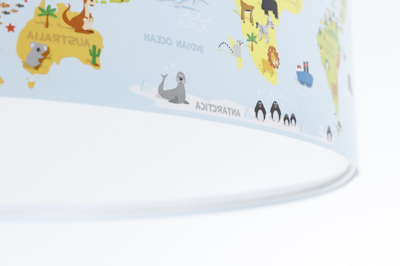 Lampa wisząca do pokoju dziecięcego w delikatnym błękitnym kolorze z nadrukowaną grafiką przedstawiającą mapę świata ze zwierzątkami.
