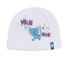 Przejściowa, bawełniana czapeczka dla malucha polskiej firmy AJS. Czapeczka jest biała, ma wywinięty, wąski otok z małą naszywką, a na przodzie rysunek kotka i napis MEOW z niebiesko-czerwonymi akcentami.