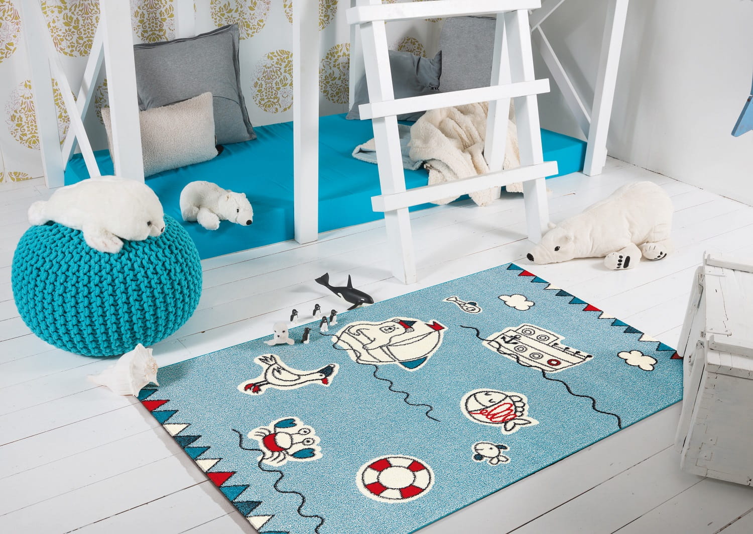 Dywan MORZE świetnie się sprawdzi w pokoju dziecięcym. Zabawne postacie zachęcą do zabawy, a harmonijnie dobrane kolory wprowadzą dziecko w morski świat przygód.