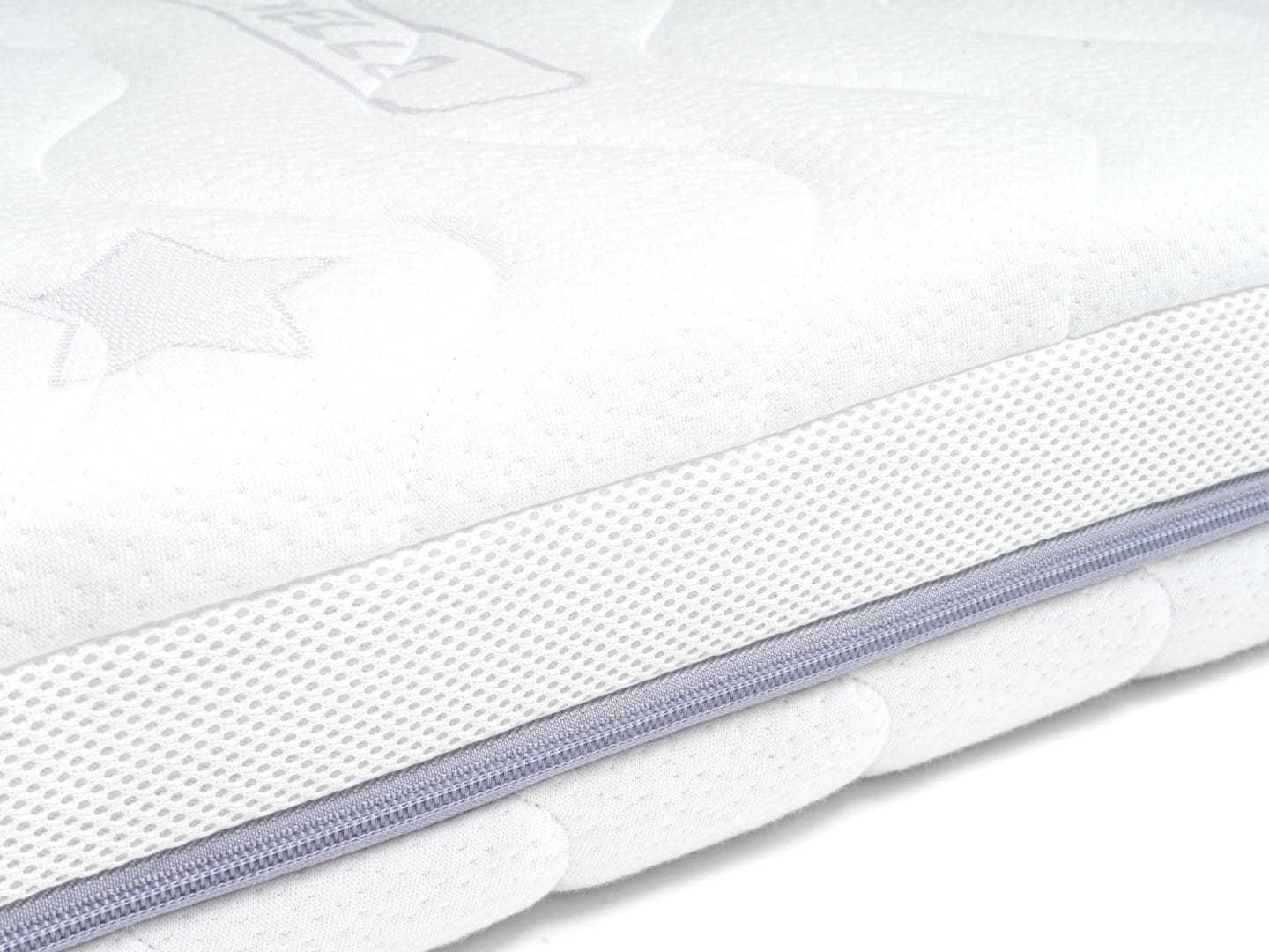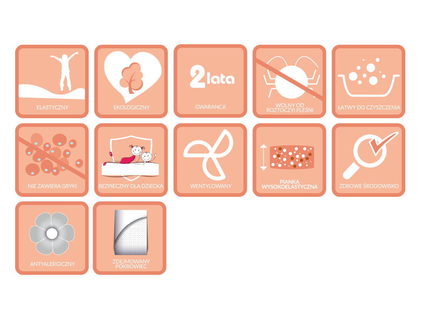 Dwustronny, wysokoelastyczny materac dla dzieci i młodzieży. Strona twarda, bezstrefowa dla dzieci młodszych i średnio twarda strefowa dla dzieci starszych z większą wagą ciała. Wygodny i trwały materac ze zdejmowanym pokrowcem. Rekomendowany do łóżek piętrowych. Wkład o dużej gęstości zapewnia trwałość produktu i dobre oparcie dla kręgosłupa. Wyrób Medyczny kl. I