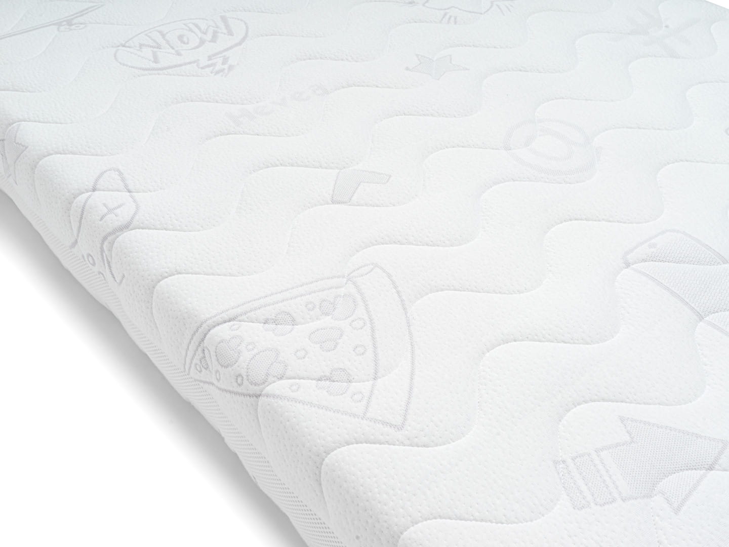 BUDOWA: Płyta z pianki wysokoelastycznej typu kaltschaum (HR) o dużej gęstości i dwóch różnych stronach użytkowych: 3 strefowej perforowanej i bezstrefowej. Wysokość wkładu 11 cm. Pokrowiec zewnętrzny z dzianiny pikowanej puszystą, antyalergiczną owatą 150g. Innowacyjna, antyalergiczna dzianina bawełniana Hevea Graffiti dedykowana dla przedszkolaków i nastolatków, których rodzice szukają niebanalnych rozwiązań. Zawiera aż 34% bawełny. Posiada podwyższone parametry paroprzepuszczalności oraz zdolności neutralizacji wolnych rodników. Tonacja biała i szara, motywy rozpoznawalne przez dzieci. Zalecane pranie w temperaturze do 40C. Certyfikat Eko-Tex Standard 100. Wkład piankowy o dużej gęstości zapewnia trwałość produktu i dobre oparcie dla kręgosłupa. Pokrowiec wykończony taśmą suwakową z trzech stron w kolorze pastelowym szarym i białym klimabandem. Skład dzianiny – bawełna 36%/pe 66%. Waga materaca 5 kg (160/80 cm) - 9 kg (120/200). Wysokość materaca 12 cm.