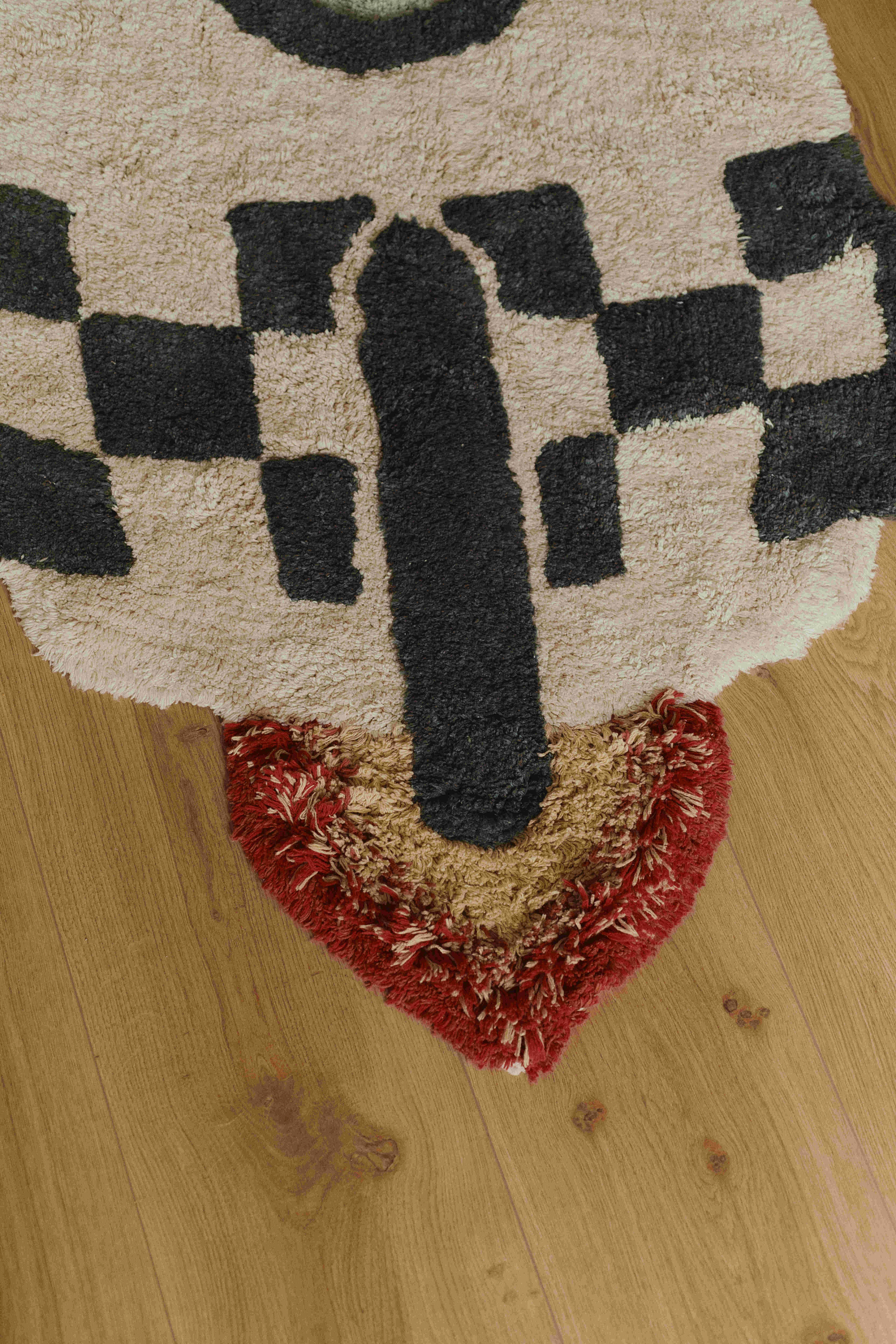 3,2,1..., Odlot! Gotowy na kosmiczną podróż z dywanikiem Rakieta. Ręcznie wykonany dywanik w kształcie rakiety w kolorze naturalnym i ciemnoszarym uzyskanym z połączenia ciemnoszarego i zielonego lastryko, który nadaje projektowi nutę vintage. Z okrągłym oknem w kolorze niebieskiej szałwii i tuftowanym ogniem w kolorze jasnego miodu, nowej terakoty i czerwieni.