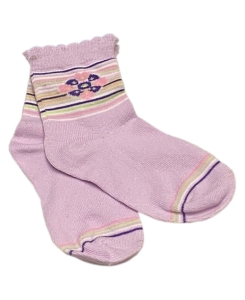 Skarpetki dziecięce polskiej marki Yo. Skarpetki dla małej dziewczynki. Skarpetki są jasno fioletowe, z ciemno fioletowymi i różowymi paseczkami i kwiatkiem. Na górze wykończenie a'la ozdobna kroszetka.
